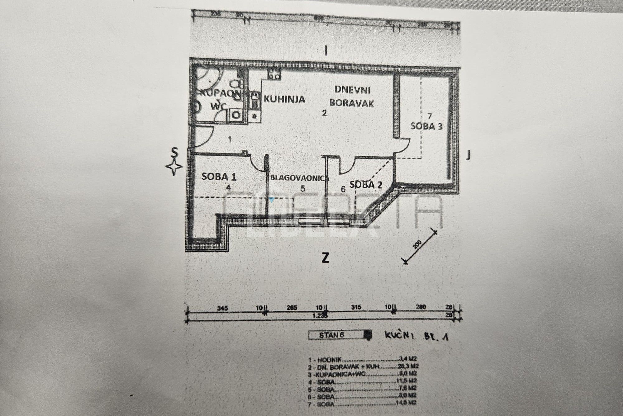 Sastoji se od dnevnog boravka s kuhinjom, blagavaonice, tri spavaće sobe, kupaonice i hodnika. Stanu pripada i spremište od 2 čm u podrumu zgrade.