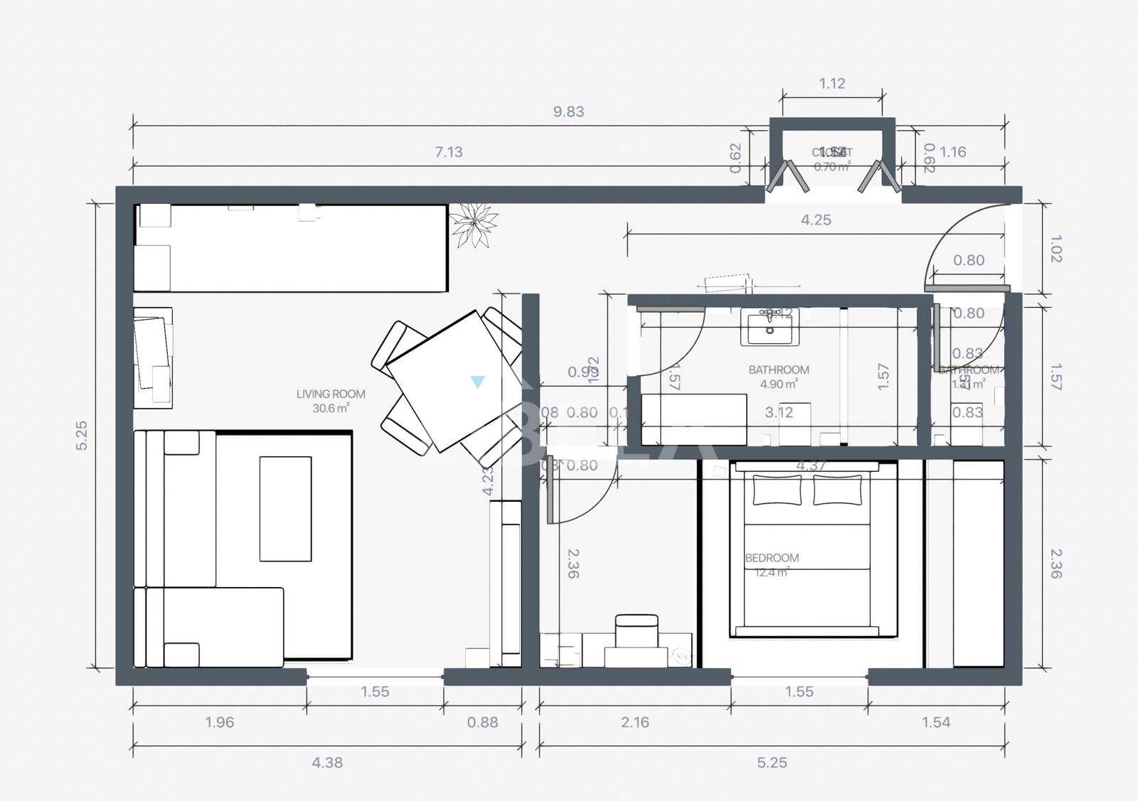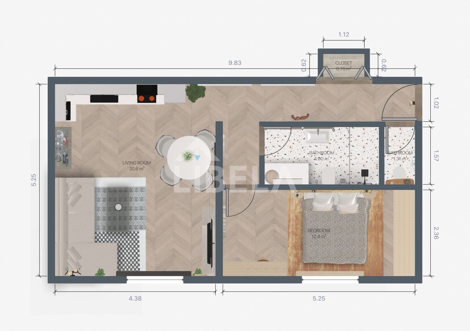 Stan se sastoji od ulaznog hodnika, dnevnog boravka s kuhinjom i blagovaonicom formiranih u open space koncept, spavaće sobe, kupaonice s wc-om te zasebno odvojenog toaleta. Stanu pripadaju i dva spremišta, jedno u podrumu zgrade, a drugo na tavanu.