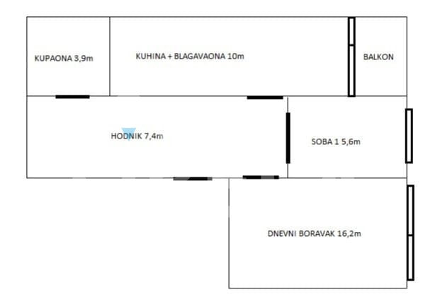 Stan se sastoji od ulaznog hodnika, dnevnog boravka, kuhinje i blagavaone kao zasebne prostorije s izlazom na balkon, spavaće sobe i kupaonice. Stanu pripada i spremište na tavanu zgrade (5.kat bez lifta).