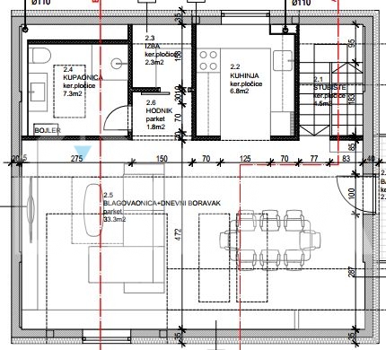 Na prvom katu su tri spavaće sobe, kupaonica i hodnik, a u potkrovlju su kuhinja, izba kupaonica i veliki otvoreni prostor blagovaonice i dnevnog boravka.
