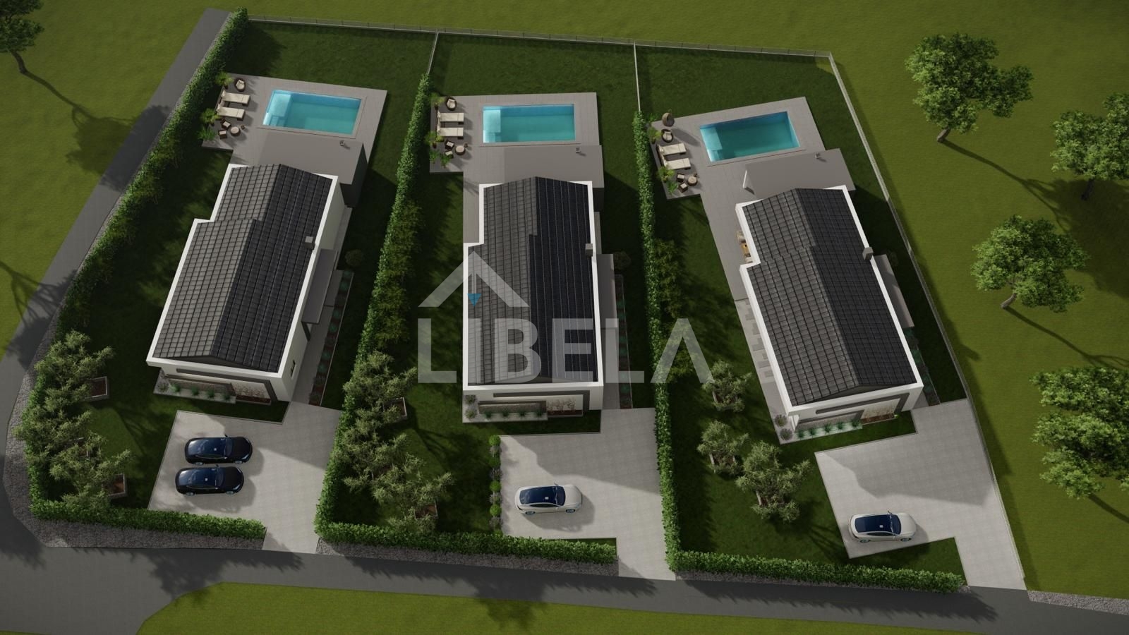 Na prodaju građevinsko zemljište ukupne površine 3250 m2, podijeljeno na tri jednake parcele, svaka predviđena za izgradnju moderne vile s bazenom.