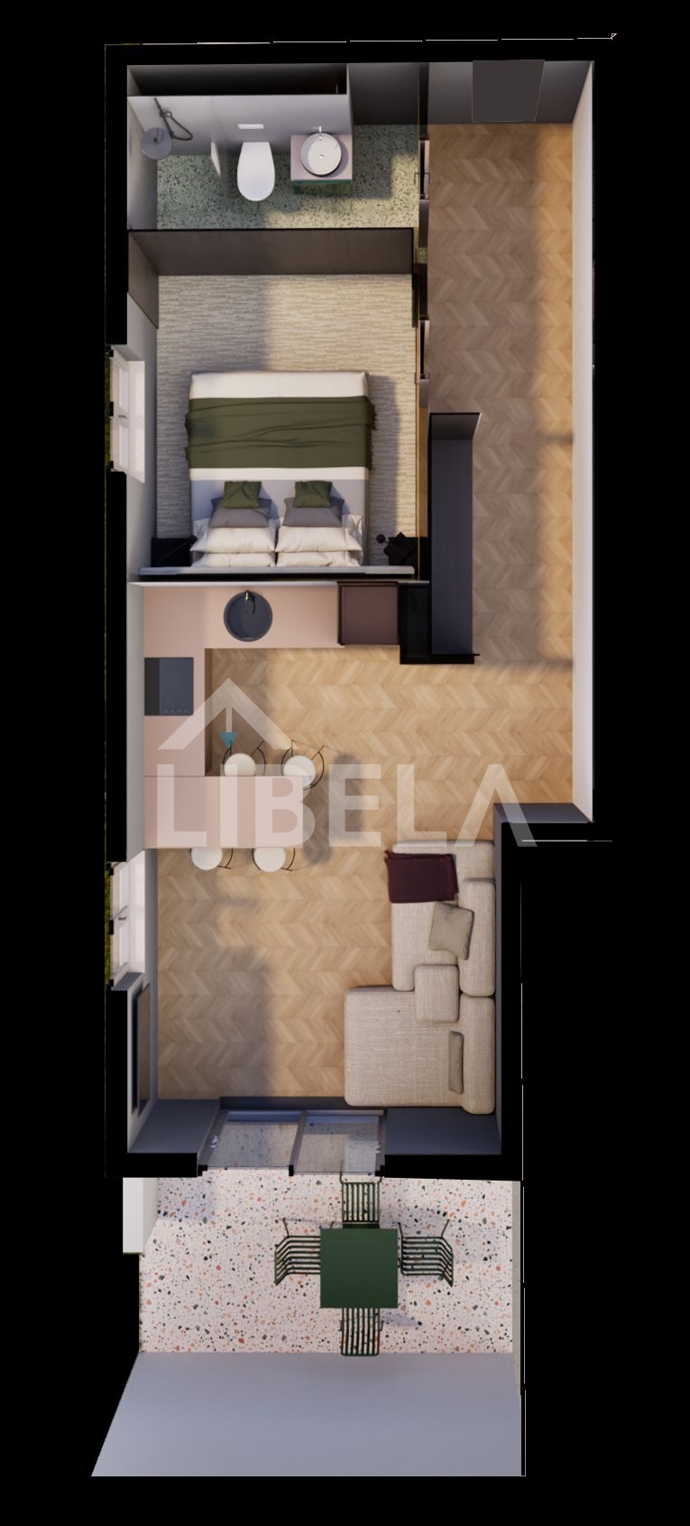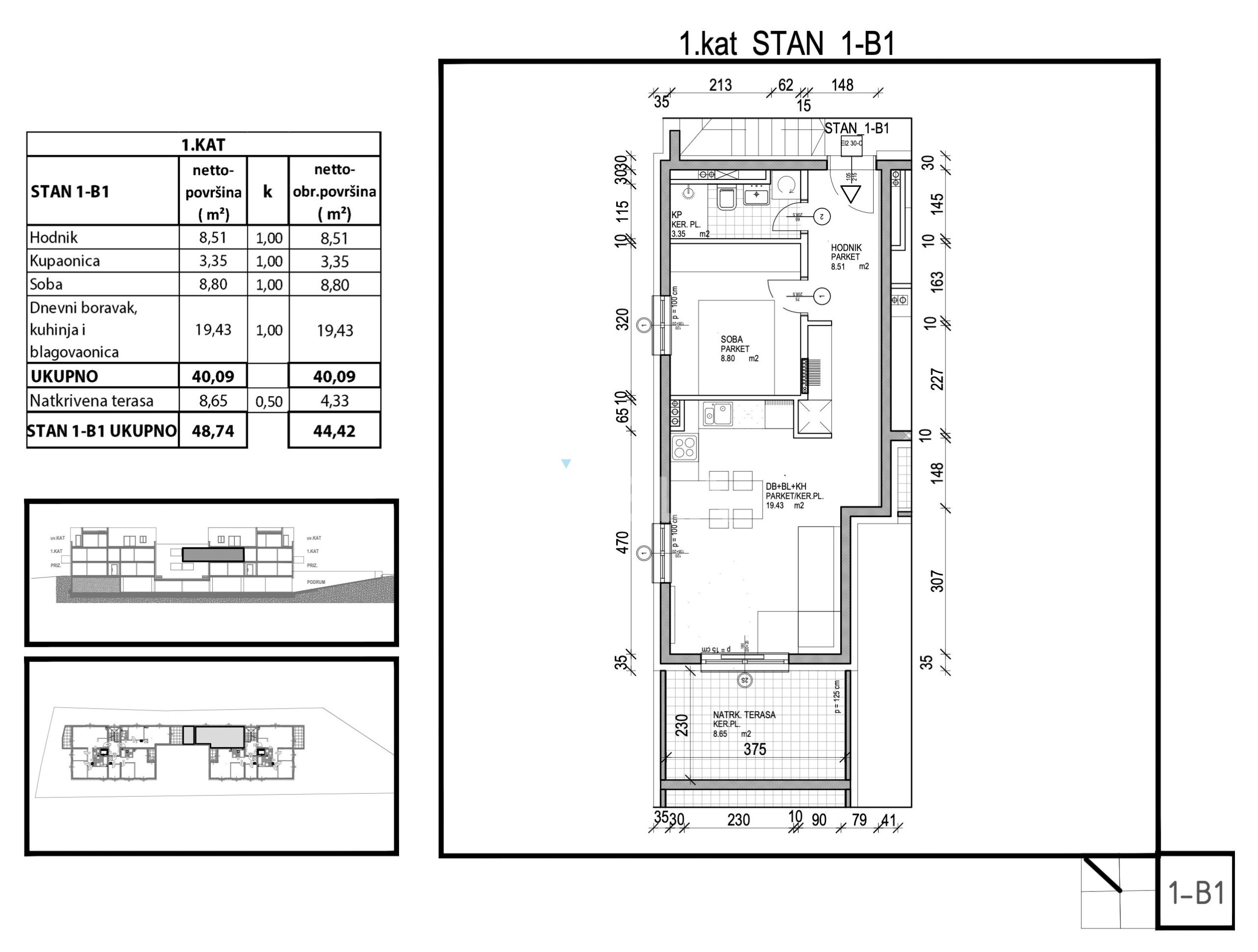 Stan 1-B1 sastoji se od dnevnog boravka s blagovaonicom i kuhinjom, spavaće sobe, kupaonice, hodnika i natkrivene terase.