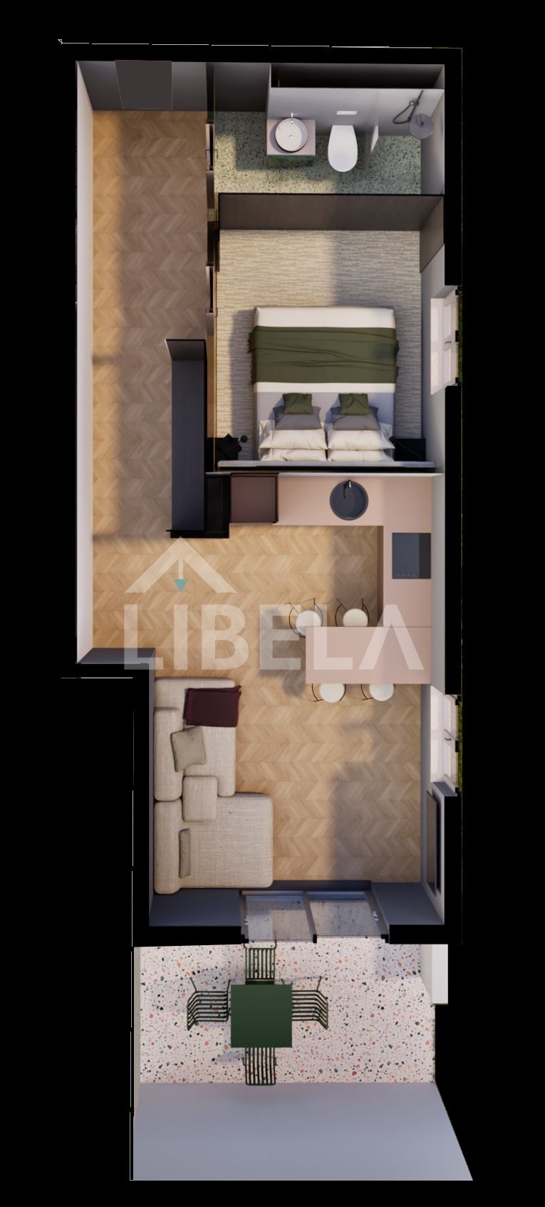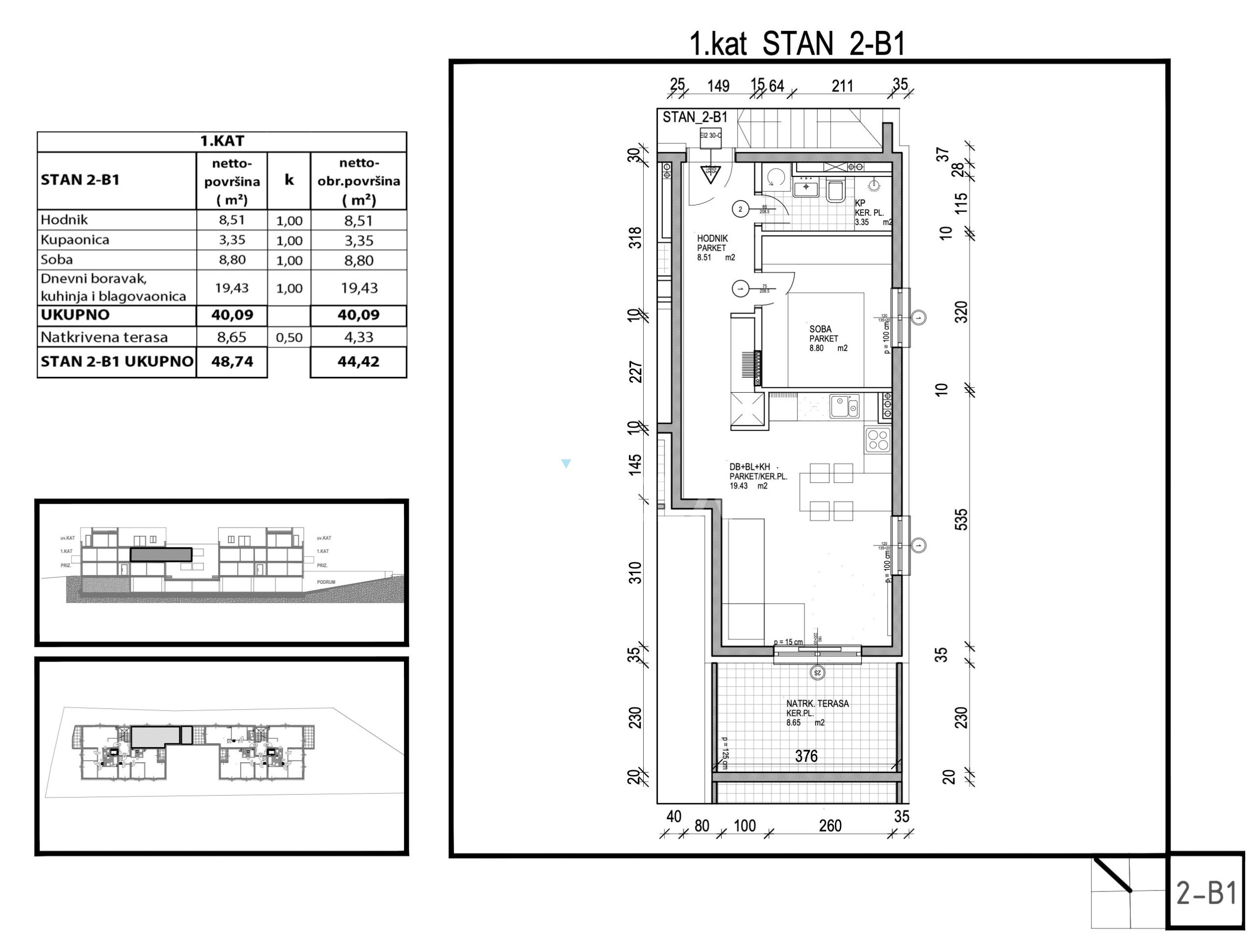 Stan 1-B1 sastoji se od dnevnog boravka s blagovaonicom i kuhinjom, spavaće sobe, kupaonice, hodnika i natkrivene terase.