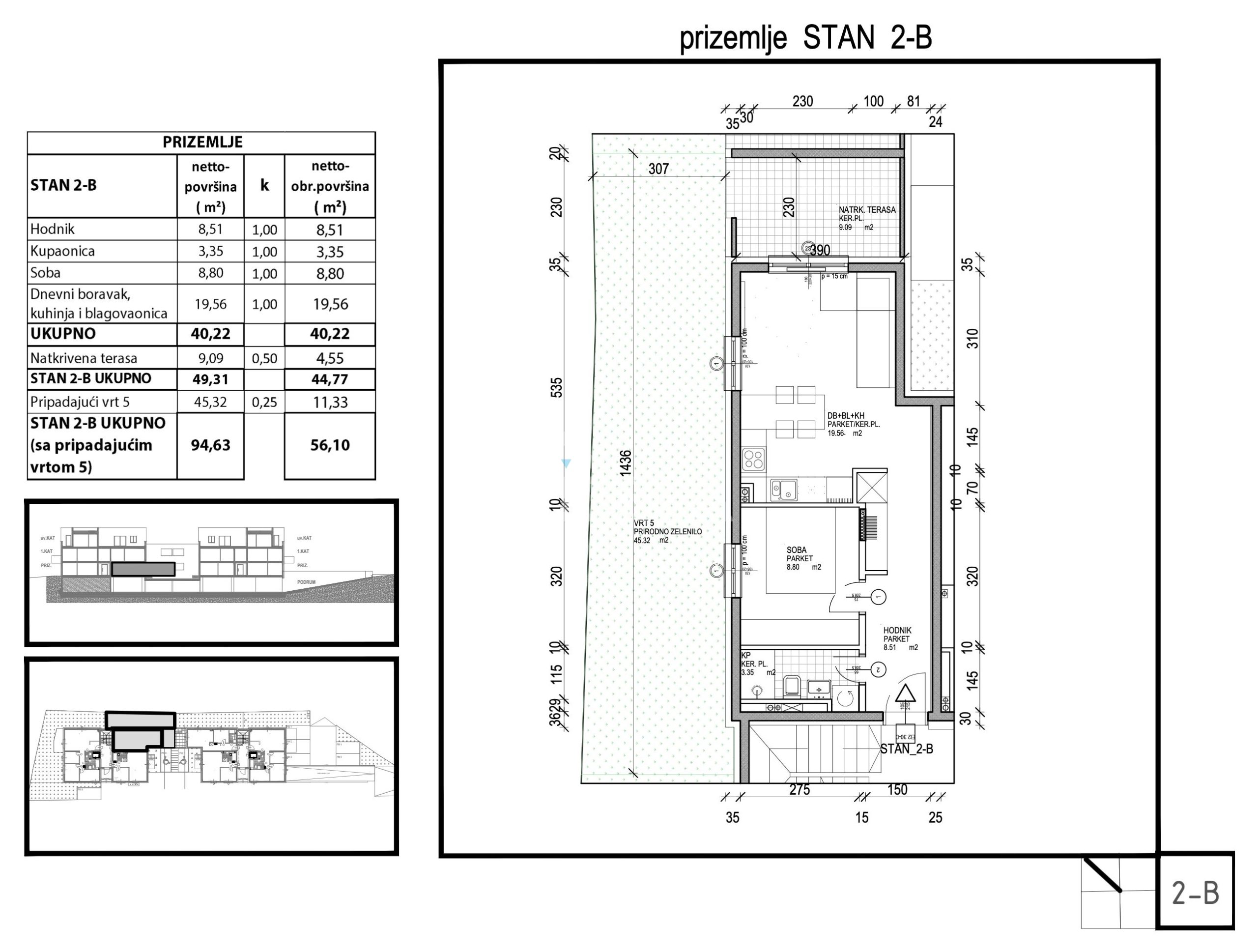 Stan 2-B sastoji se od dnevnog boravka s blagovaonicom i kuhinjom, spavaće sobe, kupaonice, hodnika, natkrivene terase i vrta.