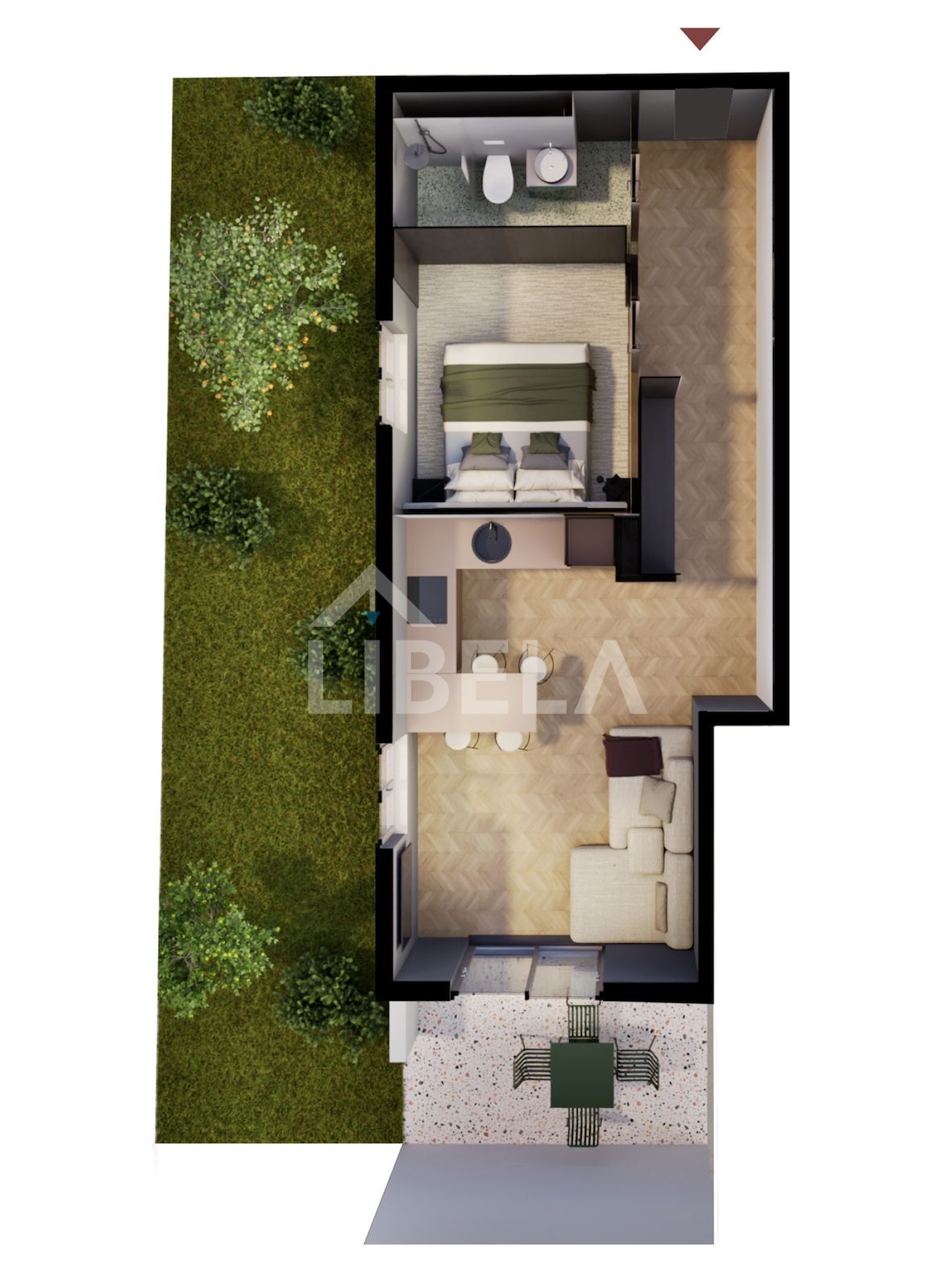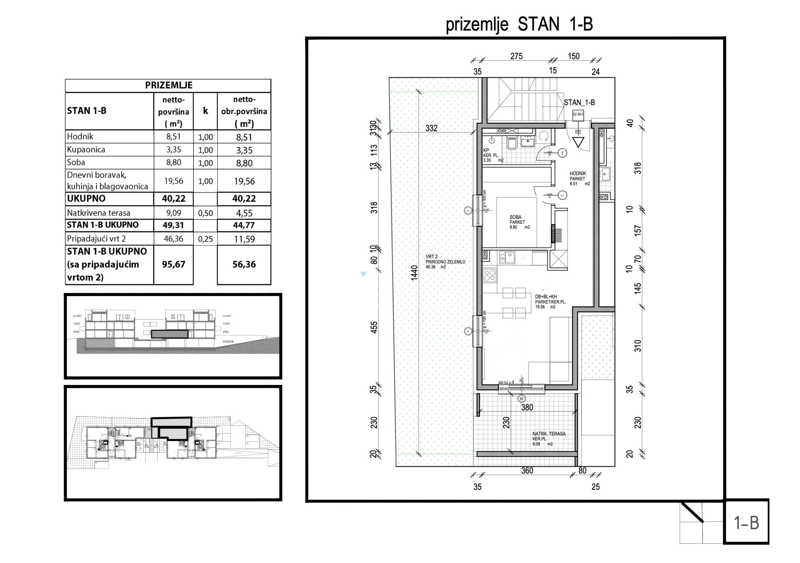 Stan 1-B sastoji se od dnevnog boravka s blagovaonicom i kuhinjom, spavaće sobe, kupaonice, hodnika, natkrivene terase i vrta.