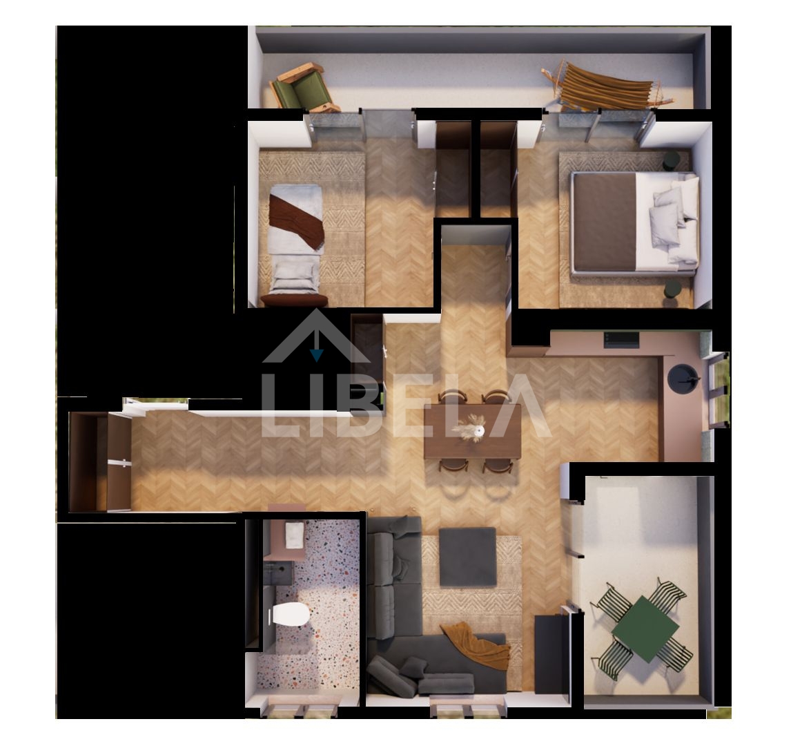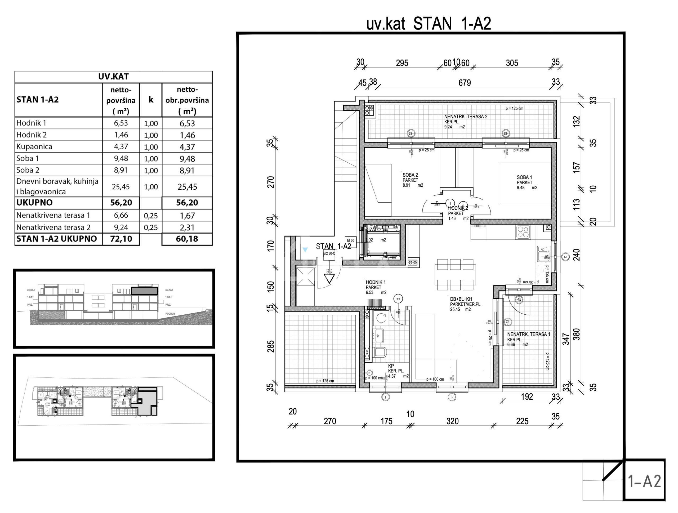 Stan 1-A2 sastoji se od dnevnog boravka s blagovaonicom i kuhinjom, 2 spavaće sobe, kupaonice, 2 hodnika i 2 terase.
