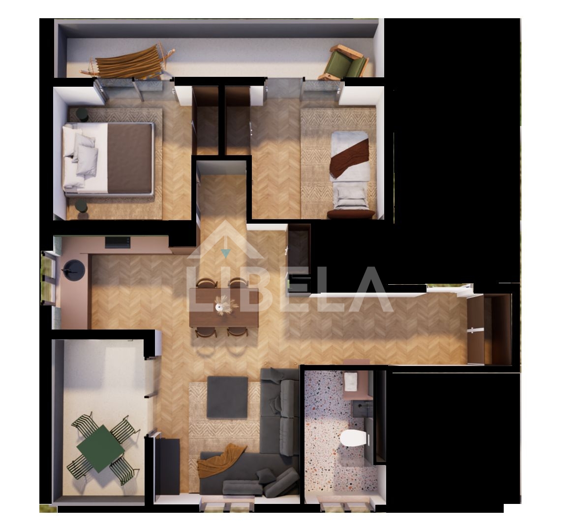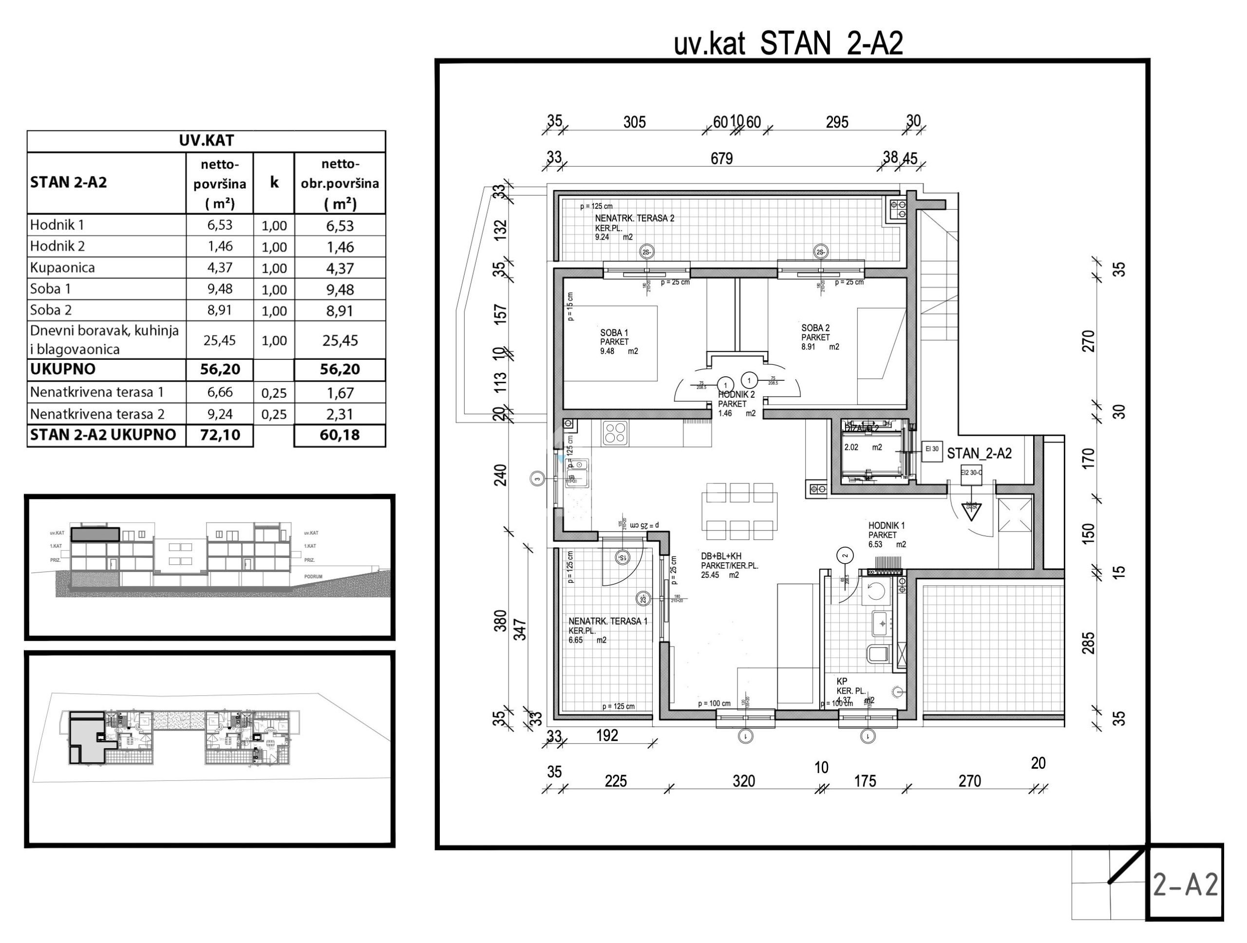 Stan 1-A2 sastoji se od dnevnog boravka s blagovaonicom i kuhinjom, 2 spavaće sobe, kupaonice, 2 hodnika i 2 terase.