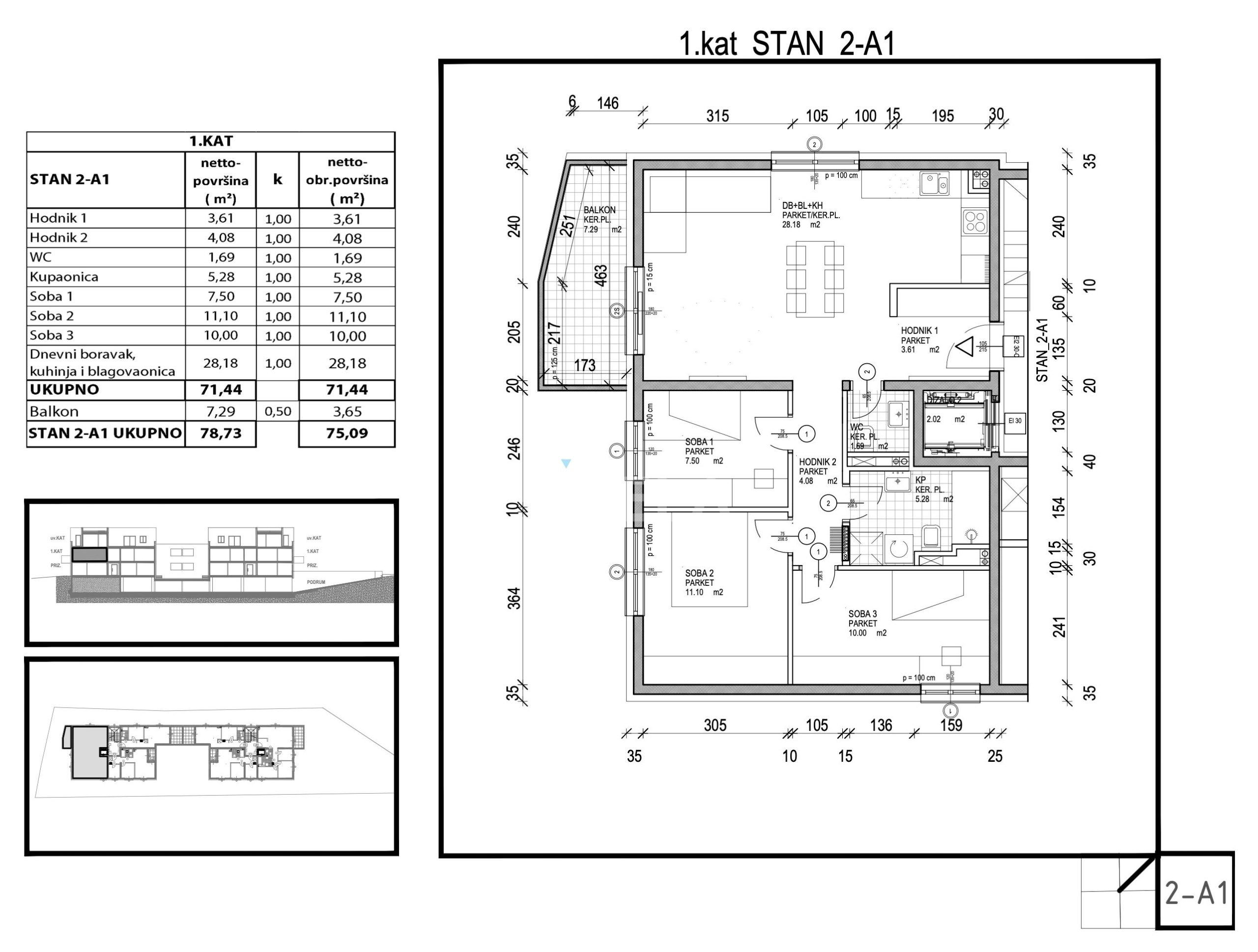 Stan 2-A1 sastoji se od dnevnog boravka s blagovaonicom i kuhinjom, 3 spavaće sobe, kupaonice, gostinjskog WC-a, 2 hodnika i balkona.