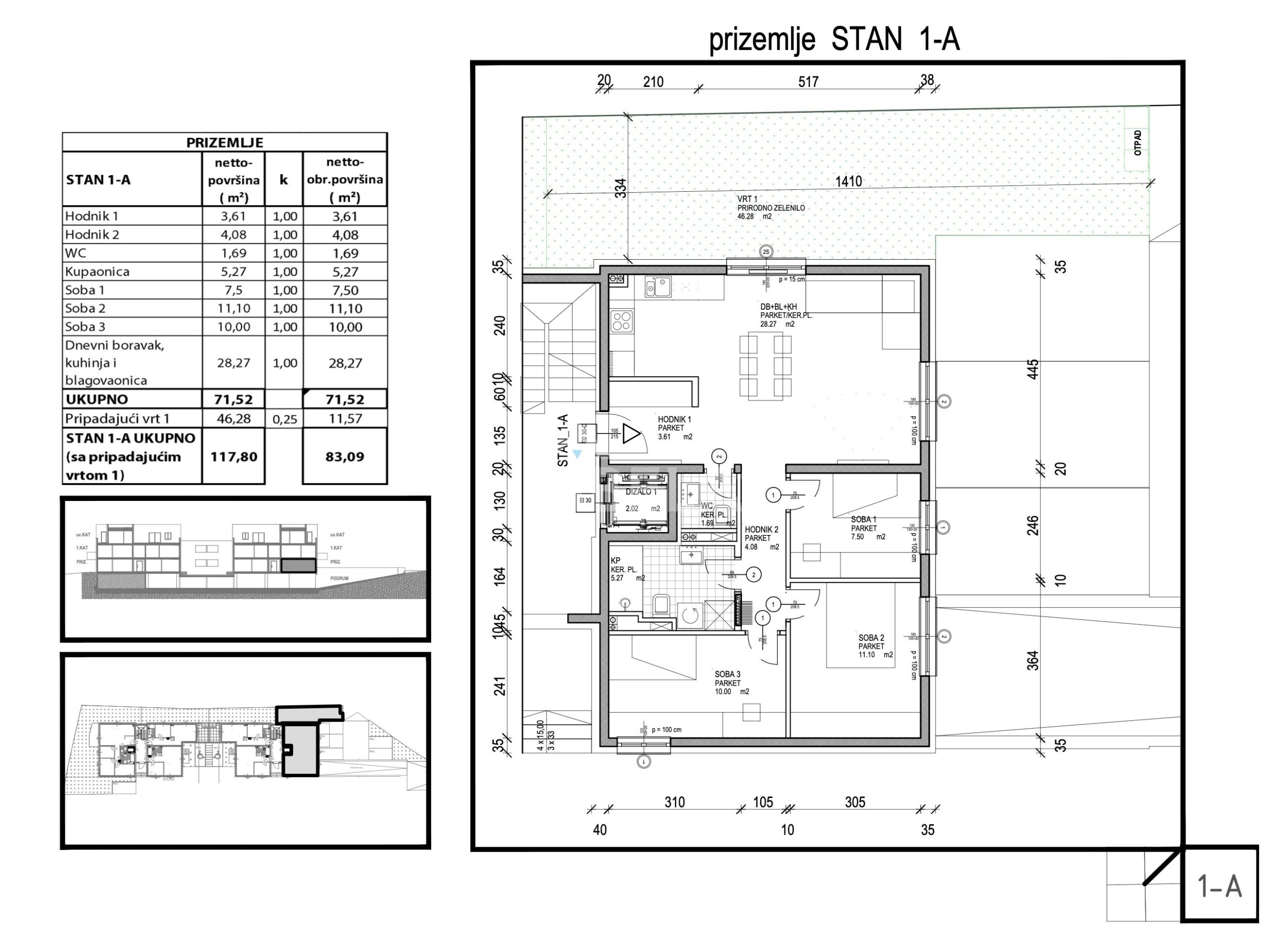 Stan 1-A sastoji se od dnevnog boravka s blagovaonicom i kuhinjom, 3 spavaće sobe, kupaonice, gostinjskog WC-a, 2 hodnika i vrta.