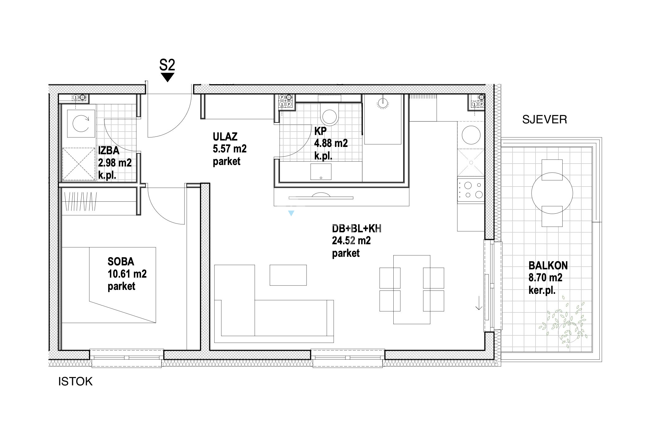Stan se sastoji od dnevnog boravka s kuhinjom i blagovaonicom, spavaće sobe, kupaonice s wc-om, izbe, ulaznog hodnika i balkona.