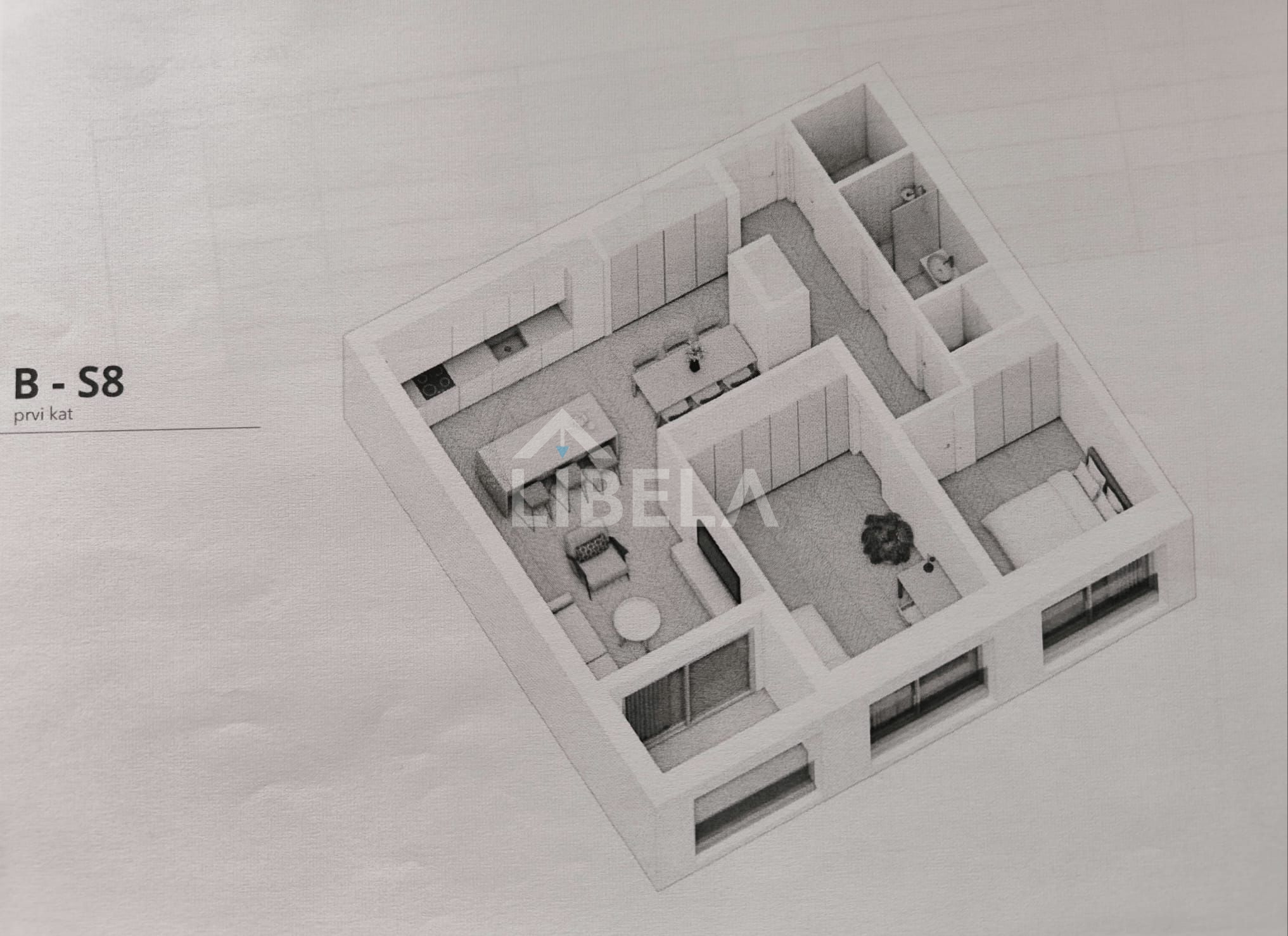 Stan se sastoji od dnevnog boravka s blagovaonicom i kuhinjom, 2 spavaće sobe, kupaonice s wc-om, wc, hodnika, te loggia.