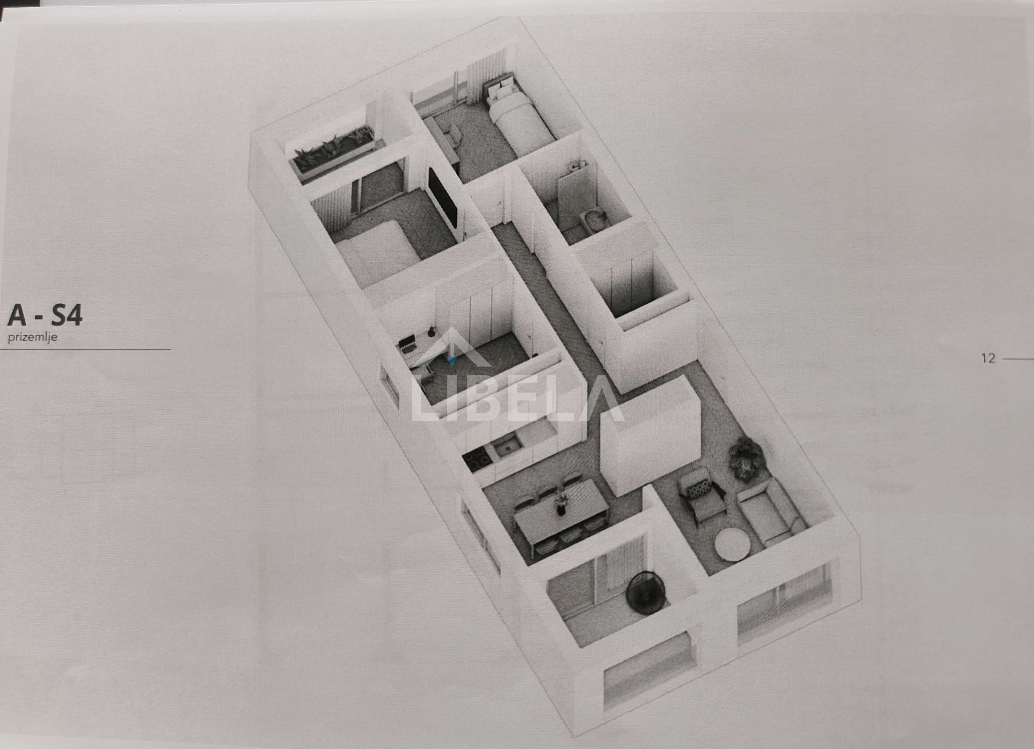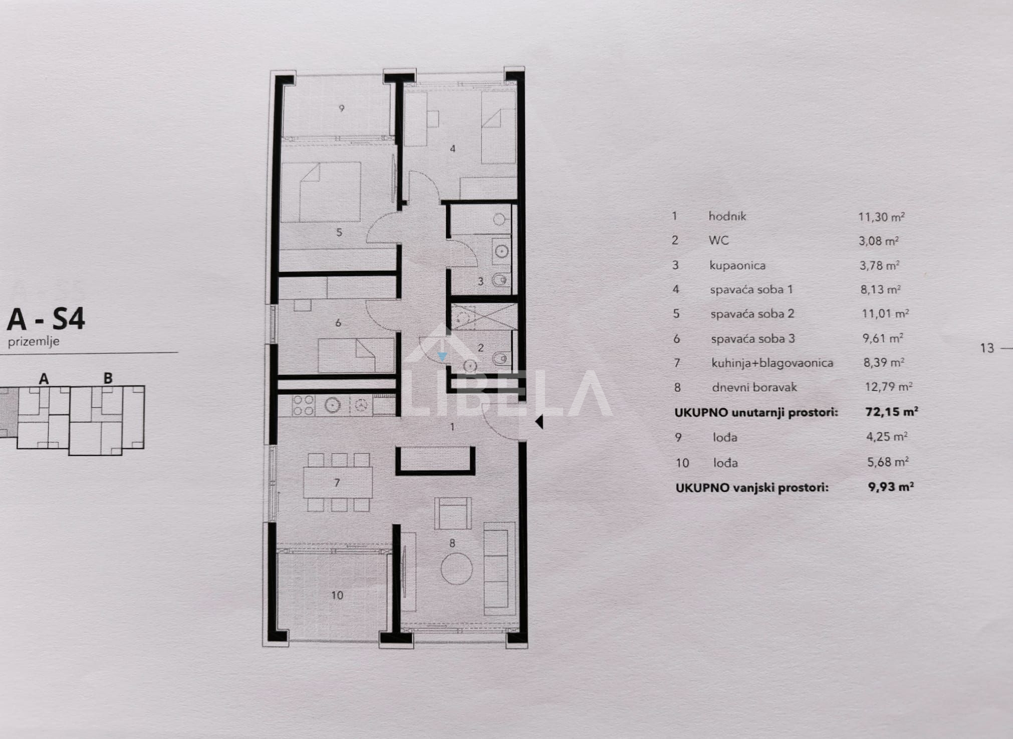 Stan se sastoji od dnevnog boravka s blagovaonicom i kuhinjom, 3 spavaće sobe, kupaonice s wc-om, wc, hodnika, te 2 loggie.