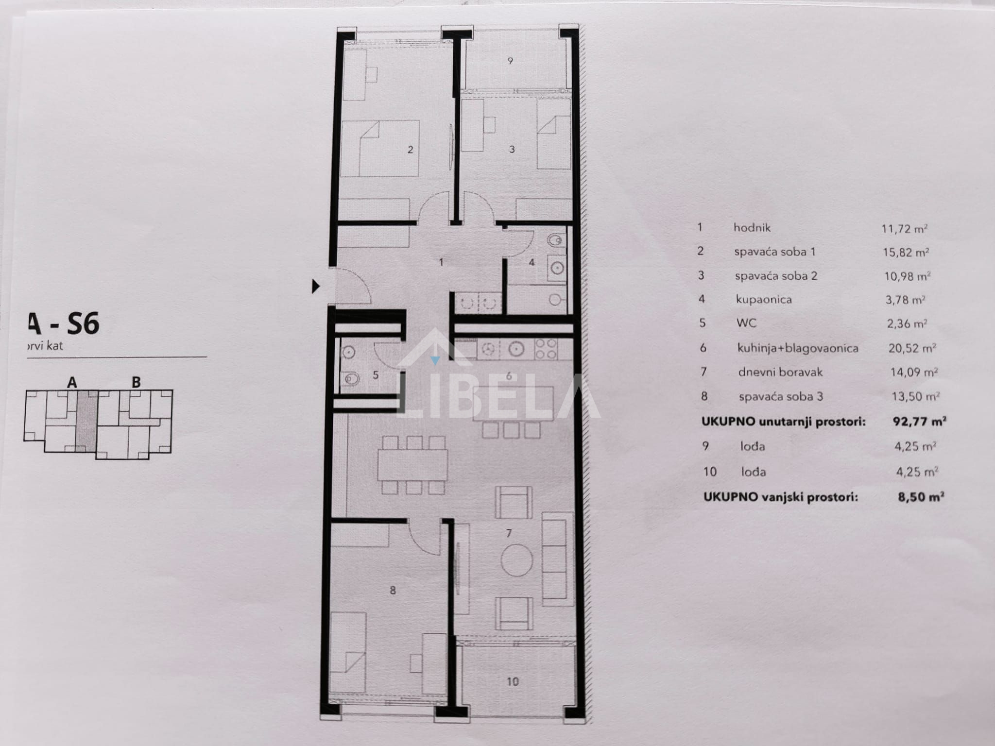 Stan se sastoji od dnevnog boravka s blagovaonicom i kuhinjom, 3 spavaće sobe, kupaonice s wc-om, wc, hodnika, te 2 loggie.