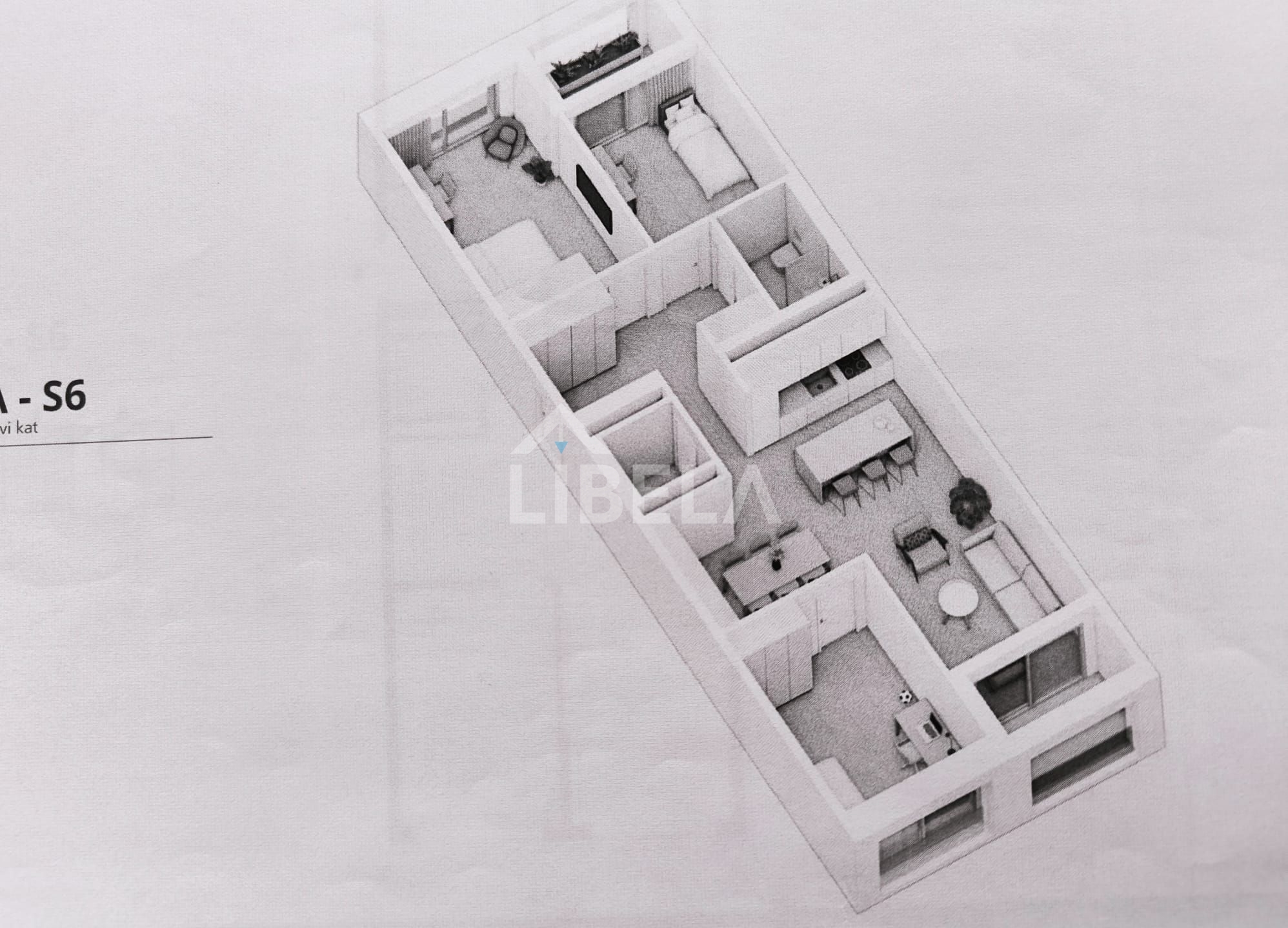 Stan se sastoji od dnevnog boravka s blagovaonicom i kuhinjom, 3 spavaće sobe, kupaonice s wc-om, wc, hodnika, te 2 loggie.