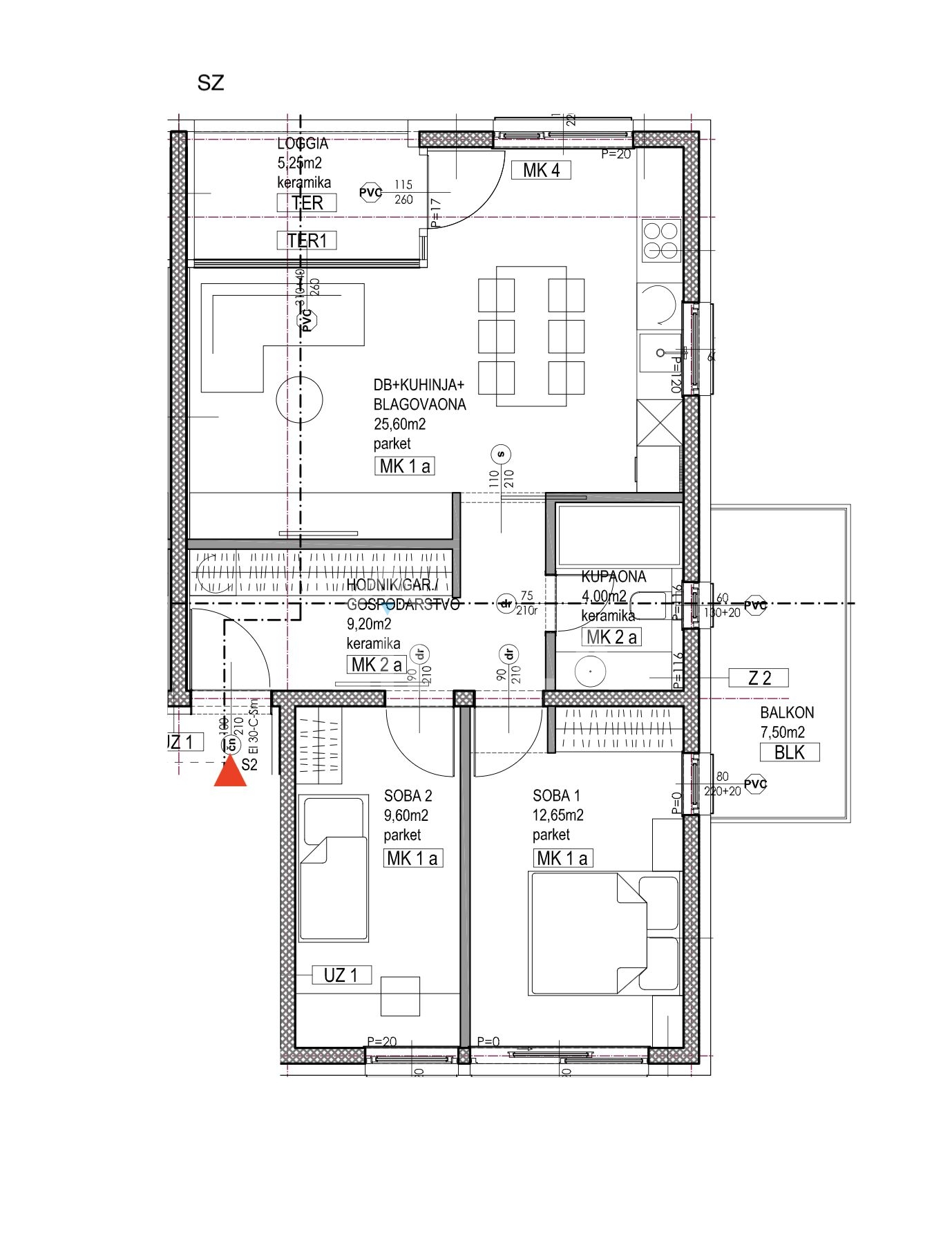 Stan A-S2 sastoji se od dnevnog boravka s kuhinjom i blagovaonicom, 2 spavaće sobe, kupaonice, ulaznog hodnika, balkona i loggie. Stanu pripadaju spremište, garaža i vanjsko parkirno mjesto u prizemlju zgrade.
