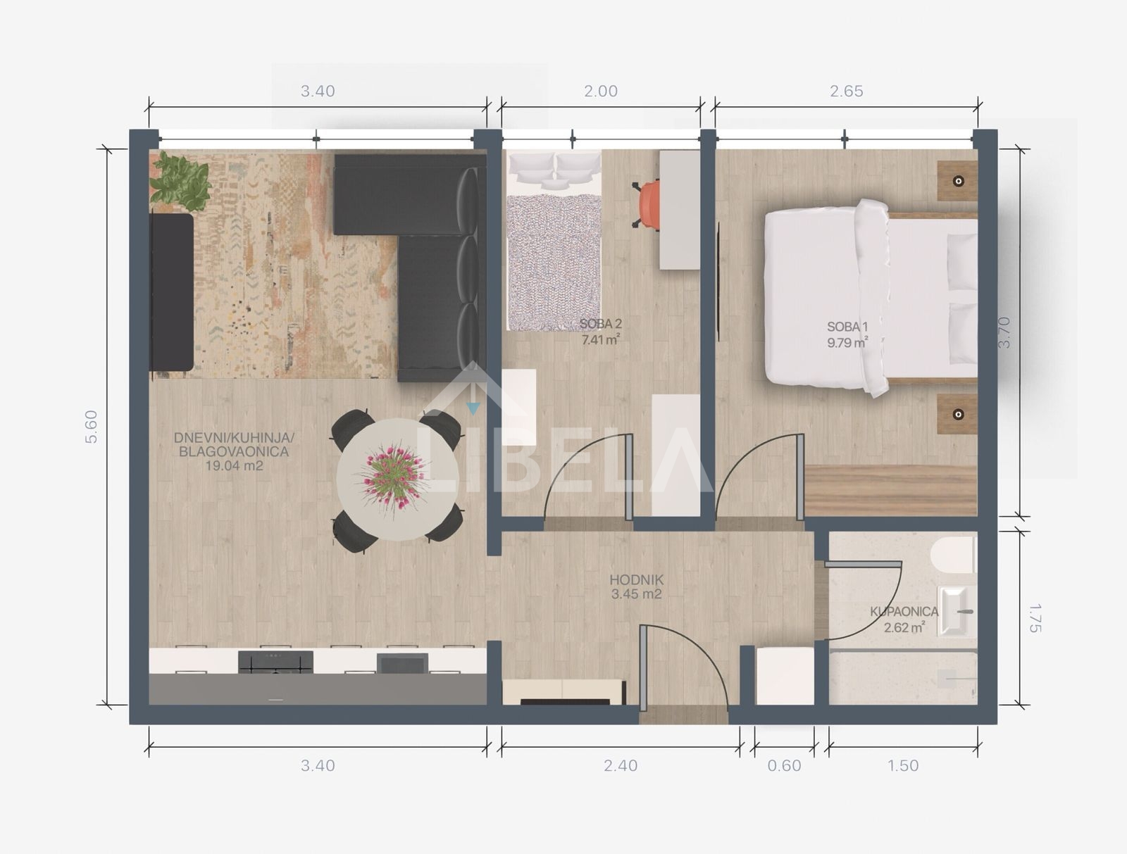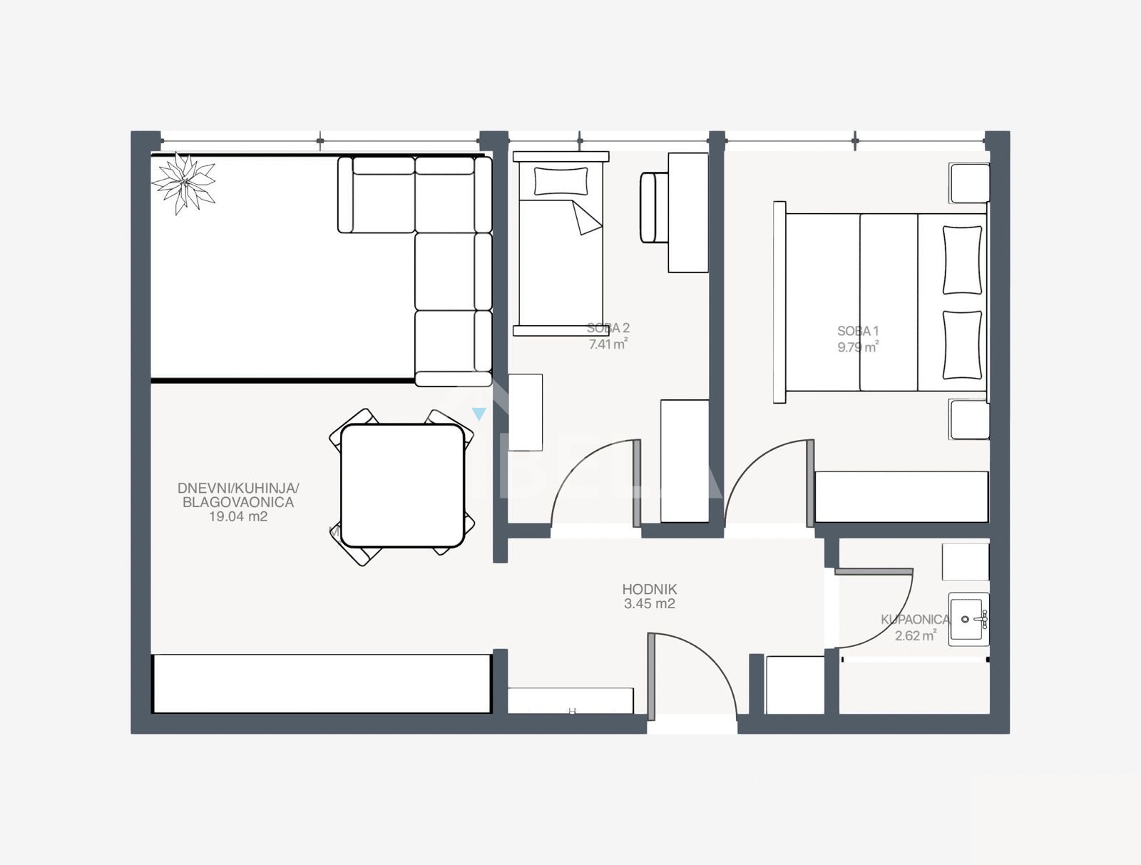 Stan se sastoji od ulaznog hodnika, dnevnog boravka, kuhinje i blagavaone formirane u open space koncept, dvije spavaće sobe, zasebne izbe za perilicu rublja i sušilicu te kupaonice.