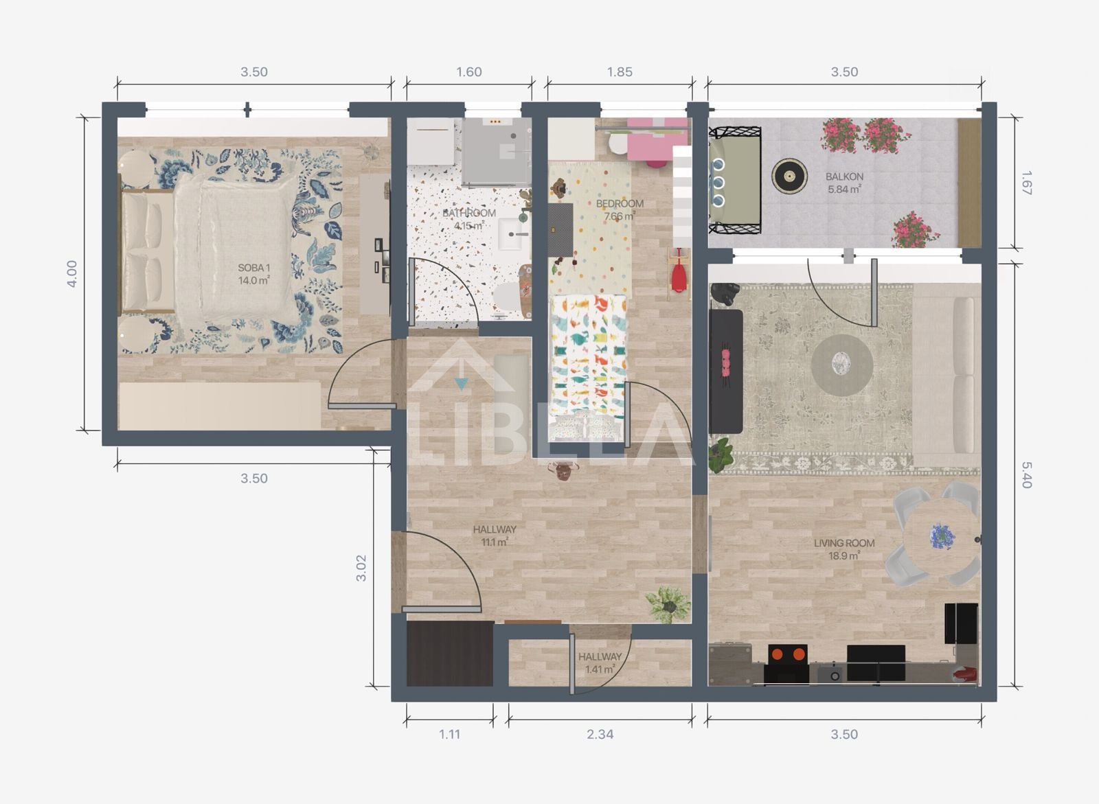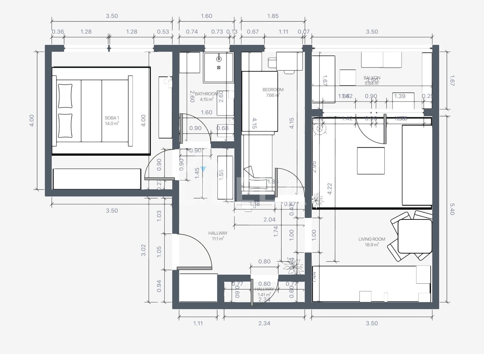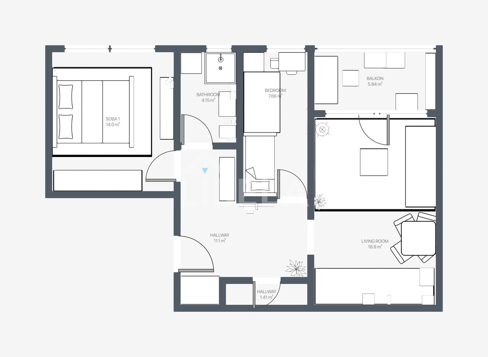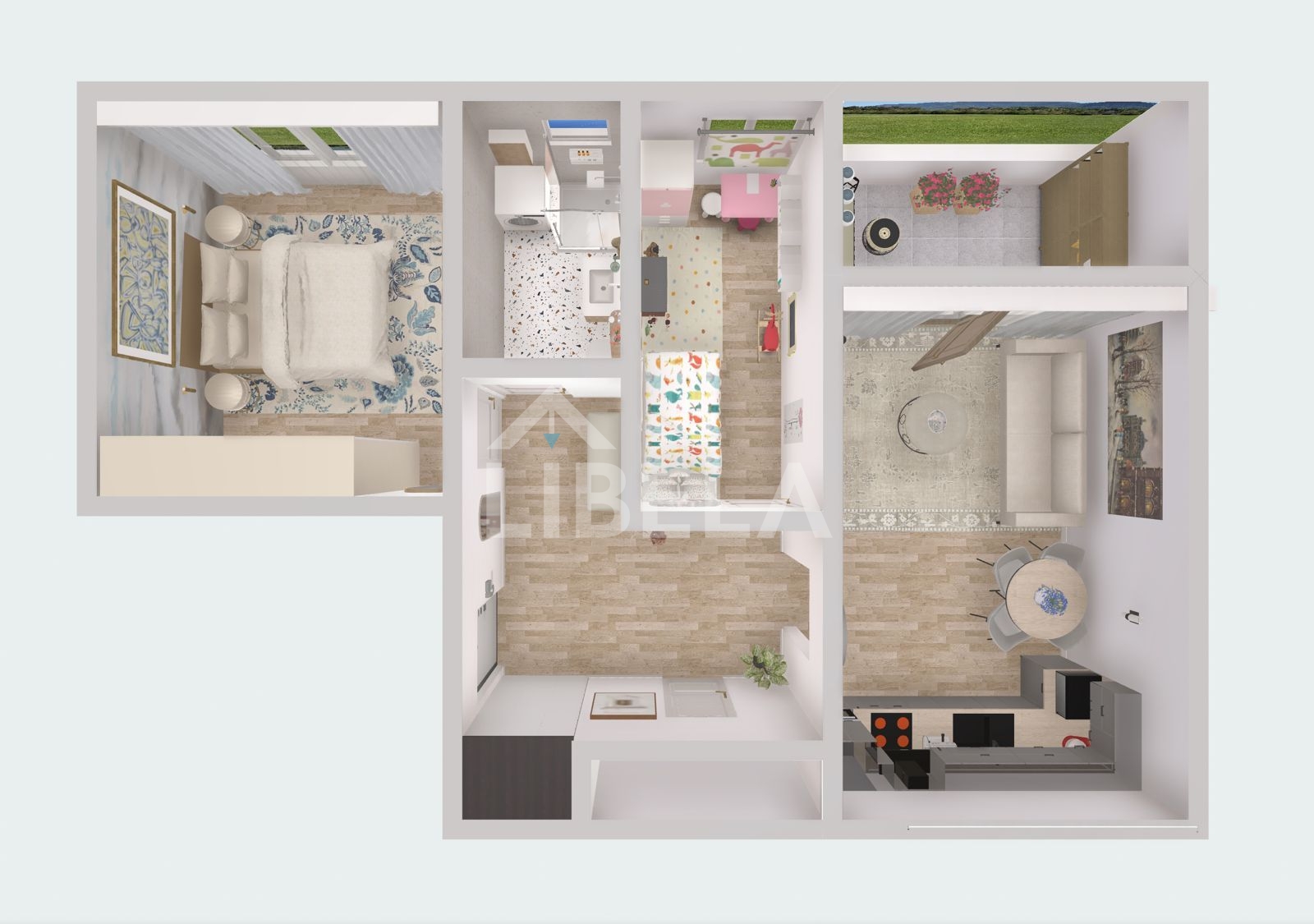 Sastoji se od ulaznog hodnika, dnevnog boravka s kuhinjom i blagovaonicom formiranih u open space koncept, dvije spavaće sobe, kupaonice, ostave i balkona.