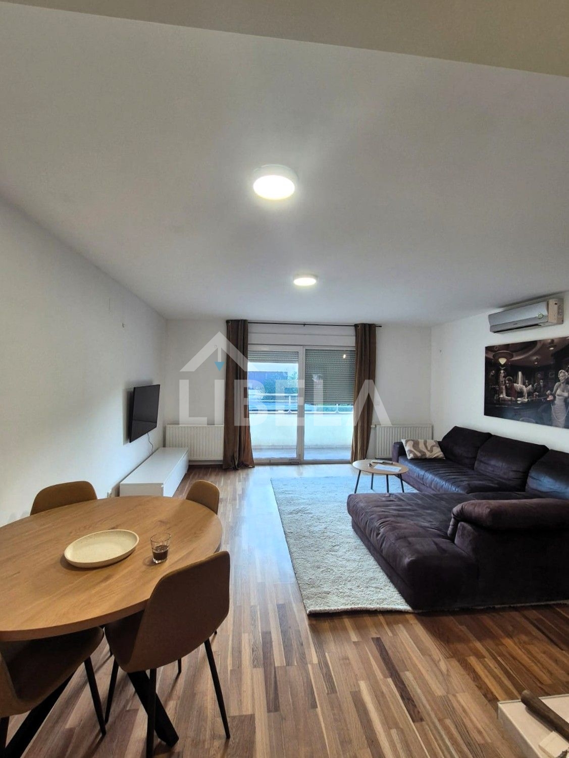 Stan se sastoji od prostranog dnevnog boravka sa kuhinjom i blagovaonicom, te izlazom na loggiu od 5 m2, dvije spavaće sobe, kupaonice i gostinjskog wc-a.
