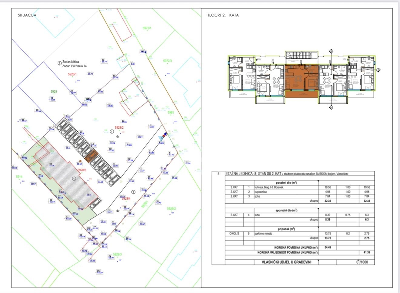 Prodaje se dvosoban stan na 2 katu u novogradnji na Bokanjcu – ukupne površine od 54,49 m2, stambene 32,35 m2 s 1 vlastitim parkirnim mjestom (13,75 m2) te lođe od 8,39 m”u zgradi od 11 stanova.