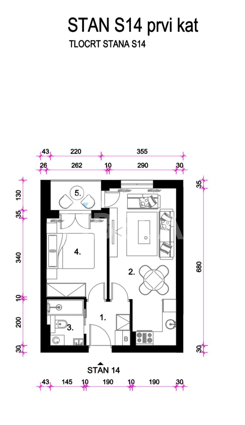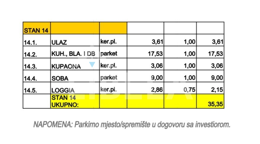 Prodaja stana na prvom katu objekta sa 19 stambenih jedinica, sastoji se od: predprostora, kupaonice, kuhinje, dnevnog boravka s blagavaonicom, loggie te 1 spavaće sobe.