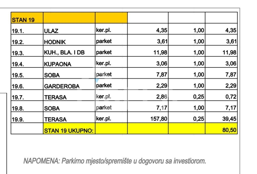 Prodaja stana na drugom katu objekta sa 19 stambenih jedinica, sastoji se od: predprostora, kupaonice, kuhinje, dnevnog boravka s blagavaonicom, 2 spavaće sobe, malom teraom od 3m2 i prostranom krovnom terasom veličine 157,80 m2.