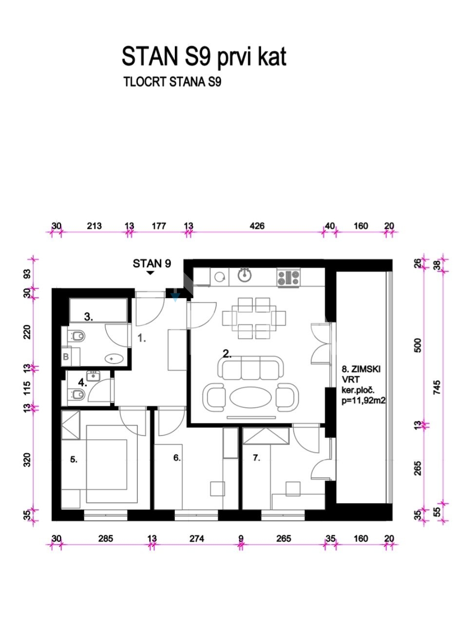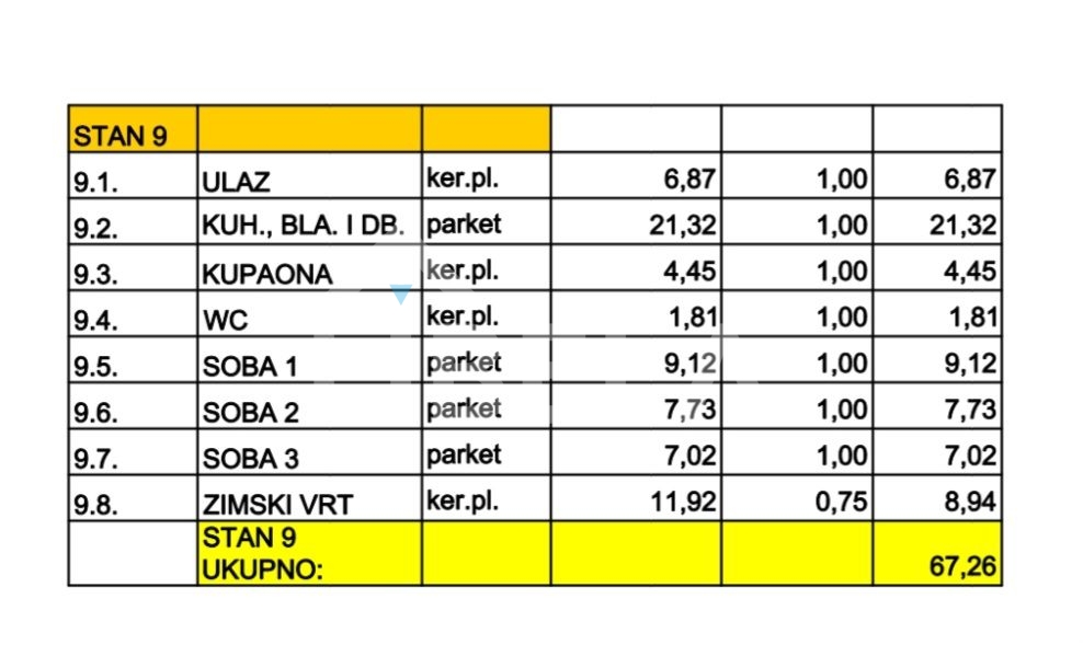 Prodaja stana na prvom katu objekta sa 19 stambenih jedinica, sastoji se od: predprostora, kupaonice, WC, kuhinje, dnevnog boravka s blagavaonicom te 3 spavaće sobe. Stanu pripada i zimski vrt tlocrtne površine 12 m2.